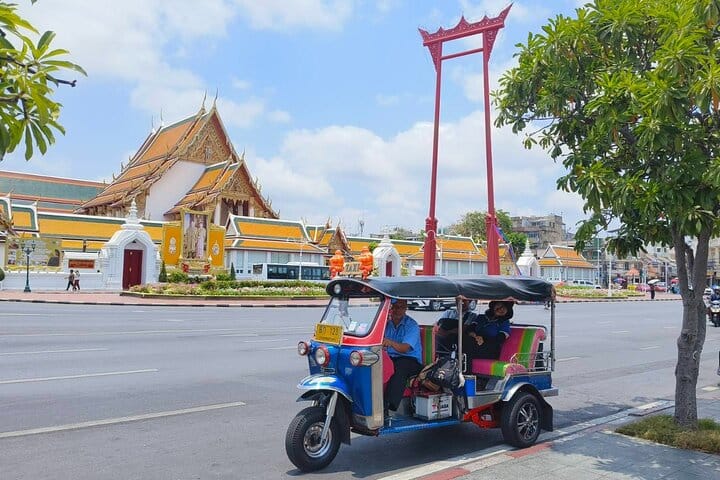 Get ready for an exciting half-day adventure in Bangkok, combining tuk tuk rides, canal cruising, and authentic street food tasting! On this private tour, you’ll visit some of the city's most iconic landmarks, including the Giant Swing, Wat Suthat, and the beautiful Marble Temple. Cruise along the Chao Phraya River on a long-tailed boat, where you’ll get stunning views of Wat Arun and the Royal Barges Museum. Taste delicious local delicacies at The Old Siam Plaza and immerse yourself in the vibrant atmosphere of Bangkok’s street life. Whether you're visiting historic temples or exploring hidden markets, this tour promises a unique and immersive way to experience Bangkok!