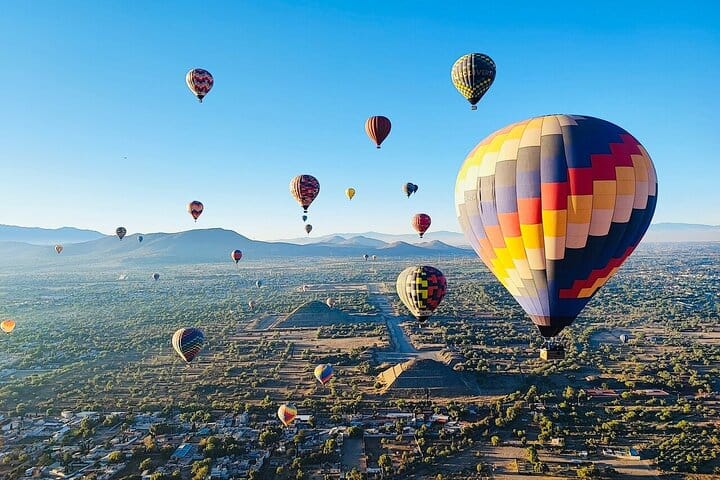 Explore Teotihuacan Valley from above on a safe and scenic hot air balloon flight