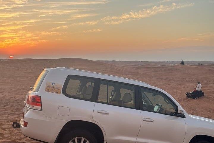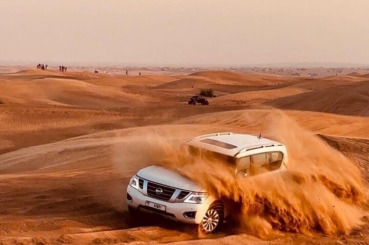 Embark on an unforgettable 6-hour desert safari that combines adventure, culture, and entertainment. Begin your journey with an adrenaline-fueled 4x4 dune bashing experience across the golden-red sands, where expert drivers navigate the dramatic dunes for an exhilarating ride. As the sun begins to set, take the opportunity to capture breathtaking photos of the desert landscape bathed in warm hues. Continue the excitement with sandboarding down the soft slopes and enjoy a short, gentle camel ride that offers a glimpse into traditional Bedouin travel. You can also dress up in classic Arabic attire for some fun and memorable photos to commemorate your adventure.