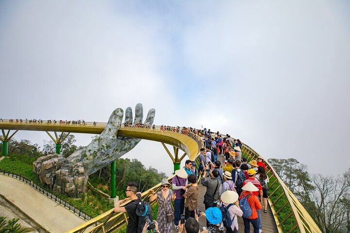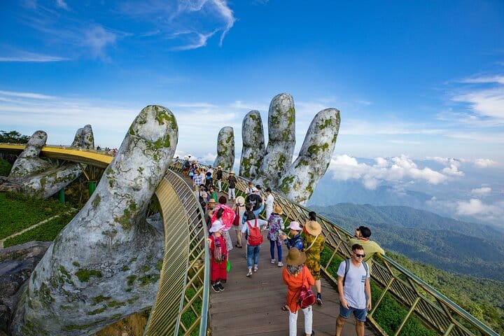 Begin your unforgettable journey from the port to the enchanting Ba Na Hills, a mountain retreat famed for its rare ability to let visitors experience four distinct seasons in a single day. Breathe in the fresh mountain air as you ascend by cable car, surrounded by panoramic views of lush valleys and drifting clouds. Your first stop is the world-renowned Golden Bridge, an architectural marvel that seems to float above the mist, gracefully held by two giant stone hands. Capture stunning photographs as you walk along the 150-meter pathway suspended between sky and mountain, an experience that feels almost otherworldly. Continue your adventure aboard the scenic hiking train, where you’ll glide past the region’s breathtaking landscapes and visit iconic spots such as Ba Na Linh Ung Pagoda, Le Jardin Garden, and the historic French villas that whisper stories of a bygone era.