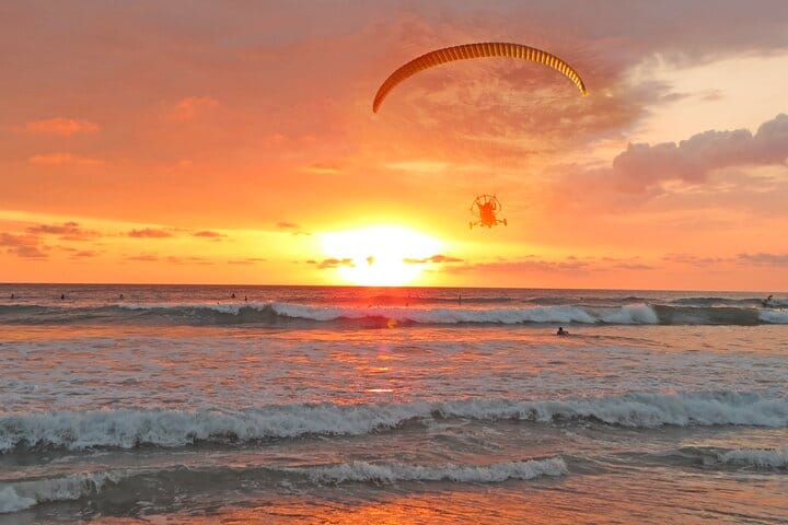 Experience the magic of a Costa Rican sunset like never before—floating high above the Pacific Ocean in a peaceful paramotor flight. As the sun dips below the horizon, the sky explodes in brilliant shades of orange, pink, and gold, casting a warm glow over the ocean and tropical forest below. This romantic and serene flight offers a rare chance to see the coastline bathed in sunset colors from a truly breathtaking perspective, making it perfect for couples, photographers, or anyone seeking a unique and tranquil adventure.