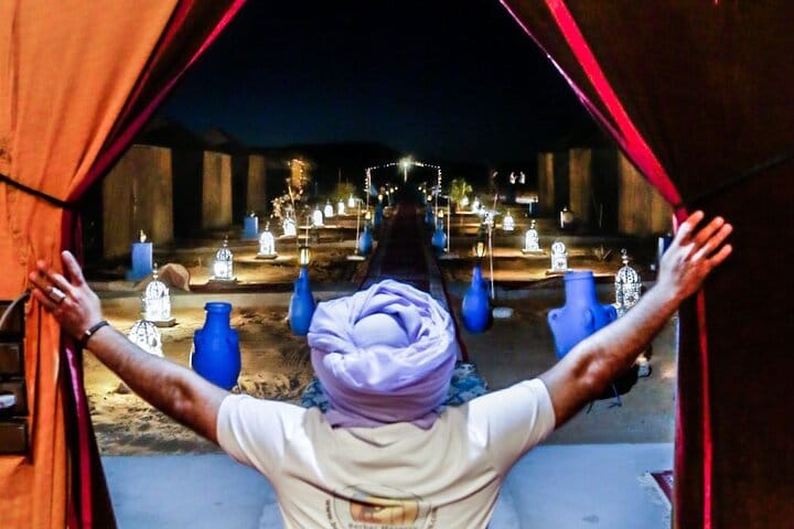 Begin your desert adventure with a private evening departure from Erfoud at 18:00. Travel for about an hour by 4WD to reach Merzouga, where you’ll ride a camel into the golden dunes of Erg Chebbi. After an hour’s journey by camel, arrive at your private comfort camp nestled in the heart of the desert. Each tent includes a private bathroom and shower for a relaxing stay. After arrival, enjoy sandboarding on the dunes and witness a stunning desert sunset. The evening continues with a delicious Moroccan dinner followed by traditional Berber music under the stars.